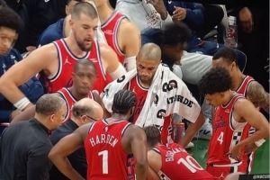 一位快船球迷赛后晒出了快船在最后21.8秒(当时哈登造成沃尔什三分犯规、裁判回看阶段)替补席图片,当时快船球员围着商讨战术,小范画战术,而主教练泰伦·卢在外圈看。