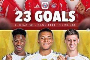 本赛季五大联赛进球最多三人组:拜仁3将23球居首,皇马16球次席